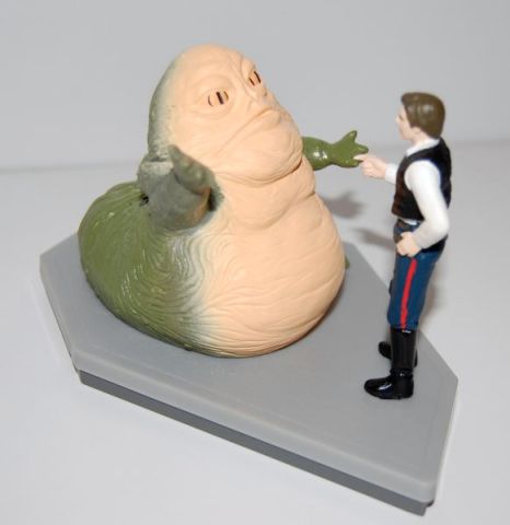 This is a plastic figure from Applause that shows the deleted scene from Star Wars: A New Hope where Han talks to Jabba at Mos Eisley spaceport. The scene was originally shot back when Jabba was going to be a human, and it really doesn’t work well to just paste a CGI Jabba on top of the actor who was originally playing the part. I really hate this scene. I dislike the CGI Jabbas (especially this one) and I think it’s ridiculous to show Jabba for a short scene in ANH and then never again until Return of the Jedi. You lose all of the surprise value from first seeing him in Jedi. And we’re really supposed to believe that Han can step on Jabba’s tail and get away with it? Give me a break.