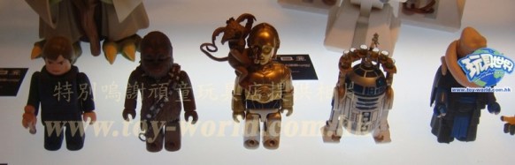 At a recent Asian toy fair, Medicom announced that the next round of Kubricks will have a Jabba’s palace theme. We don’t yet have any details about price or release date, but we do know that Jabba and his throne will apparently be a sort of “build a figure” that you collect the parts for by buying the other figures in the set. Included in the line are Jabba on his throne, Bib Fortuna, C-3PO (with Salacious Crumb), Jedi Luke (with rancor bone), Amanaman, drink-serving R2-D2, and Chewbacca (although I’m not sure how he differs from the previously released figure).