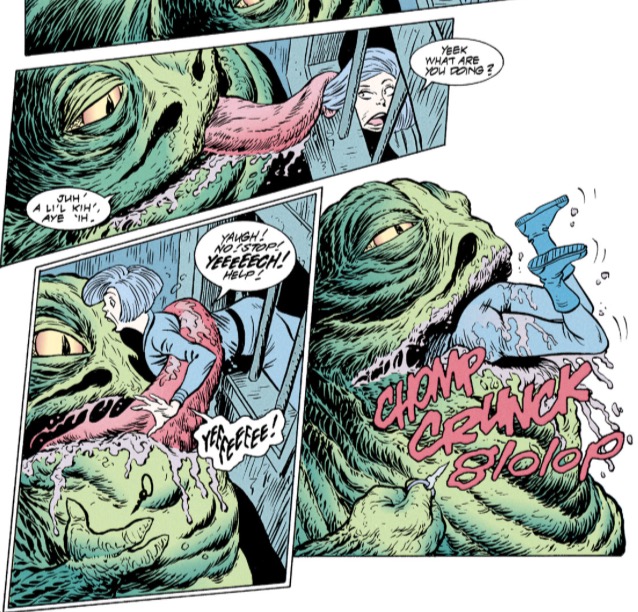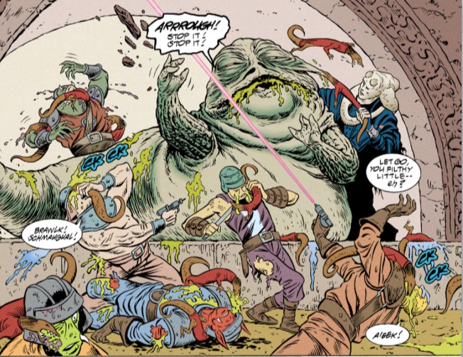 In “The Dynasty Trap” we see Jabba being much more active than I might have thought possible, killing several people with his bare hands (and body). He even, gulp, swallows someone whole, which I’m not entirely sure I buy.