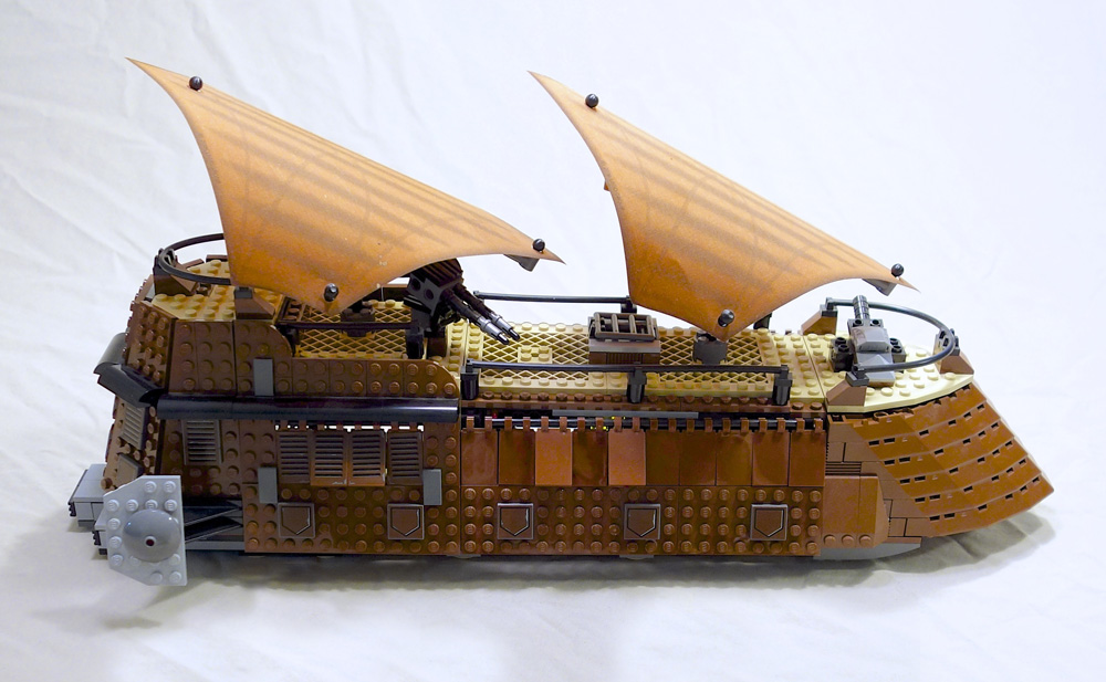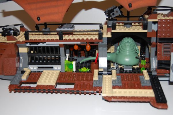 It’s an impressive set. It’s about a foot and a half long, and opens up on hinges on both sides to reveal Jabba’s mobile throne room, a galley, and a brig. It also comes with the skiff (with a gangplank that folds out).