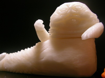 I stumbled upon the site of a Japanese chef who is a big Star Wars fan, and he has a lot of sculptures of Star Wars characters and vehicles made from vegetables. Jabba is made from a daikon (Japanese radish) and Salacious Crumb is made from a carrot.