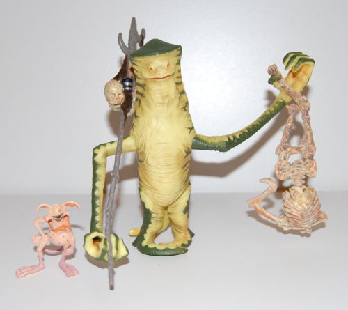 Released in 2001, this was one of the “fan’s choice” figures that Hasbro made after polling their customers about which characters they wanted made. I think this is only the second Amanaman figure that has been made, the first being the vintage Power of the Force figure that came out in 1985, so I imagine that was one reason the fans wanted a new version. Amanaman only appeared for a second in Return of the Jedi, but despite that he’s been rather popular. He comes with a staff (complete with skulls) and a headless skeleton, as well as a Salacious Crumb. Salacious is the same one that came with Kenner’s Power of the Force Oola, although I think the paint on this one isn’t quite as well done. All in all, he’s a good background character for a Jabba display, although not as tall as I might have expected.