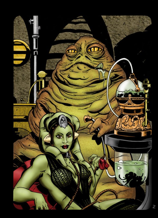 Jeff Mallinson did this great ink drawing of Jabba on his throne with Oola (before their unfortunate breakup). It measures 9″ x 12″. Click the image for a larger version.
