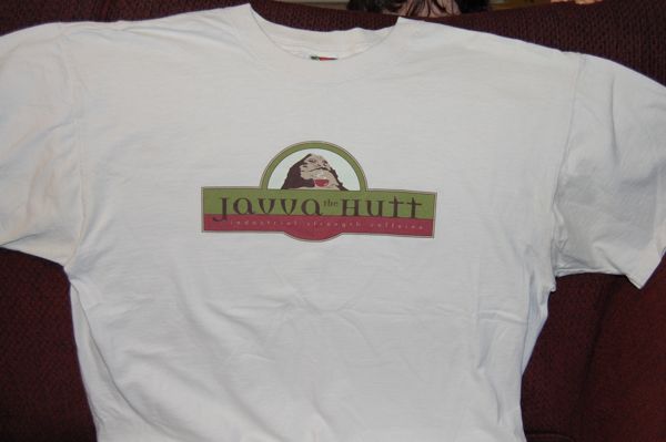 This is the newer logo. At one time they made shirts with a different logo — a painting of Jabba holding a cup of coffee and sitting on a pile of coffee beans. You can see it on the sign in the Flickr photo above. I’d like to get one of those someday as well, and maybe a coffee cup while I’m at it…