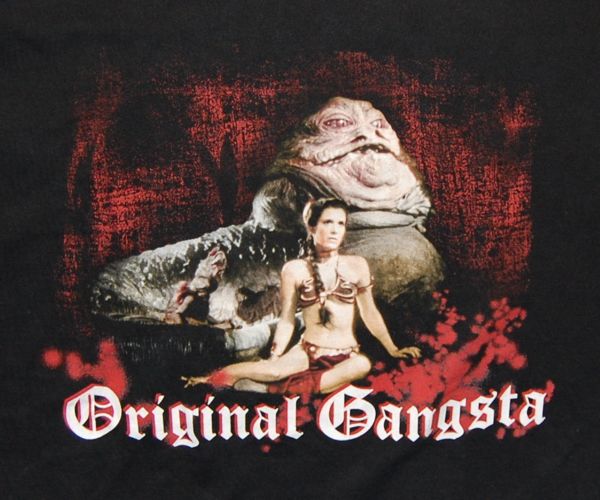 This is a shirt sold a few years ago, possibly at Hot Topic stores, although I got mine on eBay. It shows Leia and Jabba, with the motto “Original Gangsta” underneath. Thematically, it’s kind of similar to the “Slug Life” shirt I got from etsy.com.
