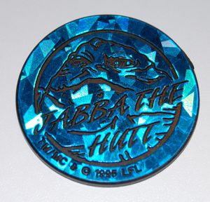 These are some of the slammers that you would have used to hit the POGs with. They’re made of thick plastic and have a sort of iridescent quality that is difficult to photograph. If you turn them in the light, the shiny flecks sparkle. It’s hard to describe but it’s actually pretty cool. They made several colors of each slammer, so in addition to the blue and orange ones here, I know there is a red one and probably a green one. too. I need to see if I can track down some of the Star Wars POGs as well.