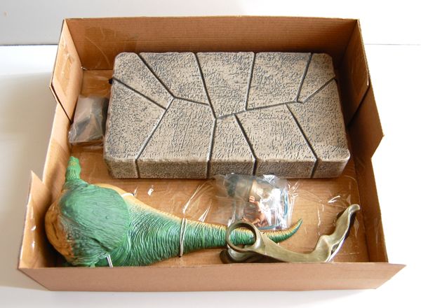 Inside the box, you have everything neatly arranged with tape and the new paper twisty ties. One plastic bag has the pillows and animal skin, while another has Salacious and Jabba’s pipe. The railing just sort of sits on top of the throne without attaching in any way. The paint job on the throne is actually a bit better in person than I had expected. I think I could probably do a better job if I repainted it, but for a production piece this is fine. The throne actually has wheels on it, allowing you to roll it back and do a dramatic reveal of the Rancor pit below. My only real quibble with the throne is that the gargoyle heads on it are considerably too small (see here). They did a good job with them otherwise, even including the hanging rings, so this is a little bit disappointing.