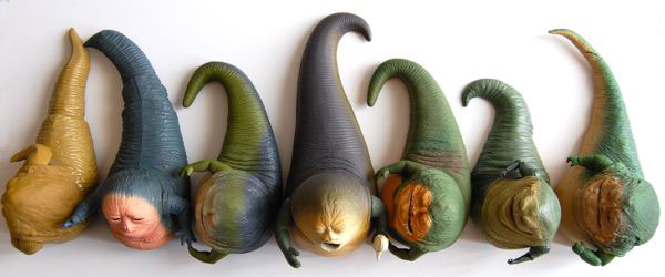 From left to right: Vintage Jabba, POTF Jabba, Jabba Glob, Spitting Jabba, Ultra Jabba, Clone Wars Jabba, Vintage Collection Jabba