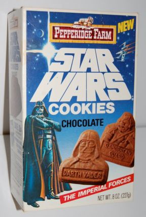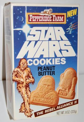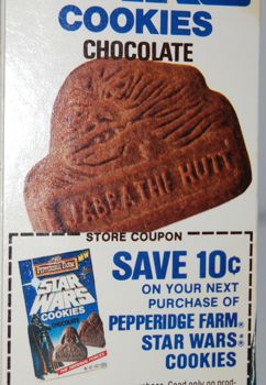 I’ve already talked about my set of Pepperidge Farm plastic tumblers, which were given out with purchase of these cookies. But here are the boxes themselves. These are for the Chocolate and Peanut Butter flavors, but there was also a Vanilla flavor that I don’t have. The chocolate cookies (aka “The Dark Side”) were the bad guys, which they called the “imperial forces” even though Jabba and his minions were not related to the empire. And they have characters like Max Rebo lumped in with the “rebel alliance.” Honestly, if we can’t expect accuracy from our cookies, where can we expect it? šŸ˜€