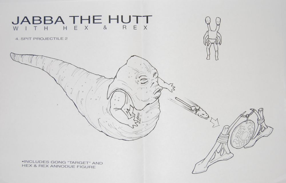 One interesting thing I learned about the set is that they were considering four different versions. They apparently knew from the start that they wanted this to be a “spitting” Jabba toy based on the scene in The Phantom Menace where Jabba spits the head of a chuba at a gong to start the podrace. But they weren’t sure how they wanted to accomplish this. One idea was a projectile shooting version that used Jabba’s arm as the trigger (this is very similar to the final figure). Then there was another projectile shooting version that had a button on the back of Jabba’s head and used a different shooting mechanism. Another was a water shooting version (and in fact, this ended up being incorporated into the final product). And finally there was a “slime” shooting version. Presumably this would have been similar to the Jabba Glob figure.