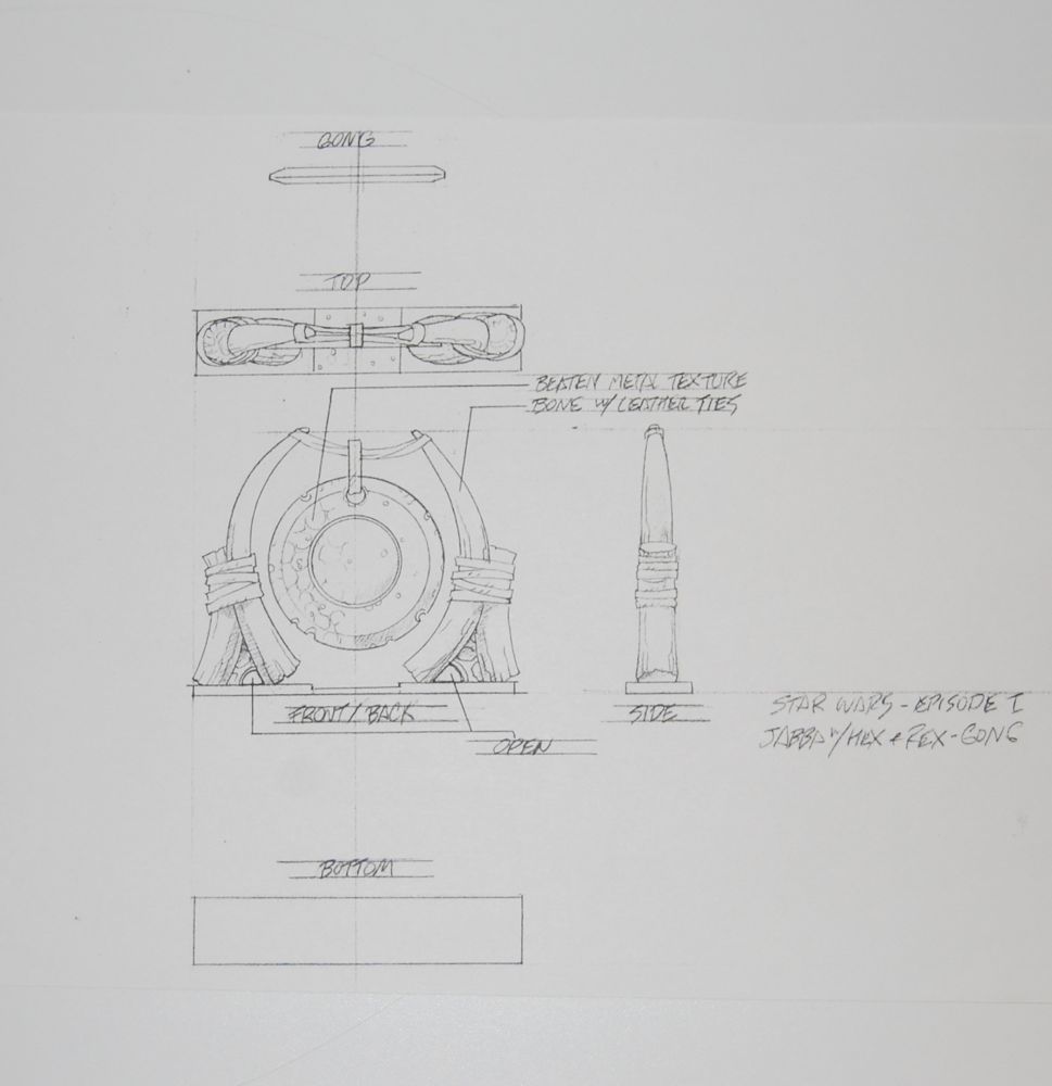 Even aside from this, the toy went through a number of changes during the design process. One change that they made was the gong. I don’t know if they were basing the design of the gong off of early concepts from Lucasfilm or if they just sort of made something up on their own, but their first design was quite different from the one they eventually used (which is fairly similar to the one in the film). There’s even a note from Lucasfilm that reads “Gong is not accurate. Should wait for reference.” You can see a photocopy of the first design on the left and the hand-drawn design that they eventually went with on the right.