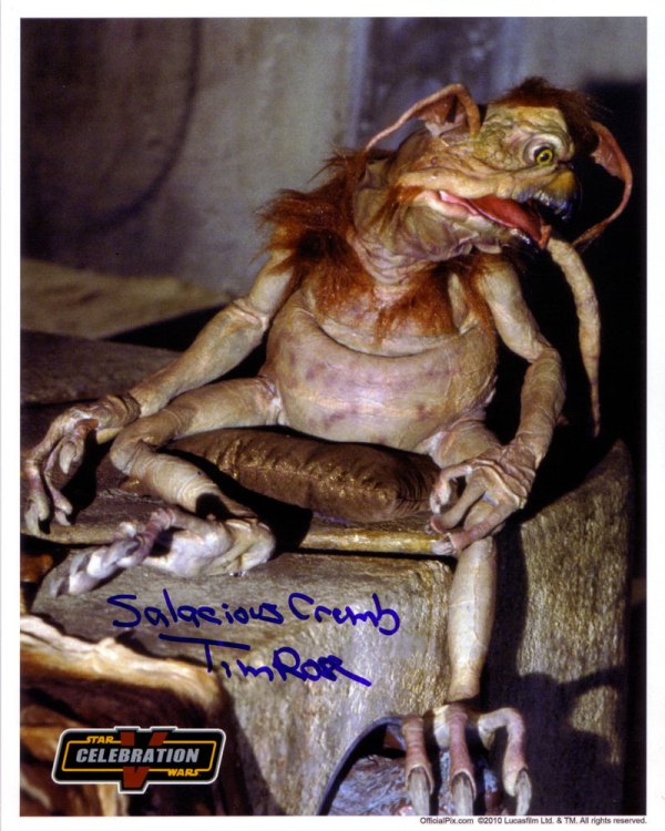 This is an autograph by Tim Rose, who was the puppeteer for Salacious Crumb in Return of the Jedi. He also did Sy Snootles and Admiral Ackbar. This is a bit of an unusual shot of Crumb. I kind of wish his head was turned toward the camera more, but you do get a nice close-up view of him and the throne that he’s sitting on.