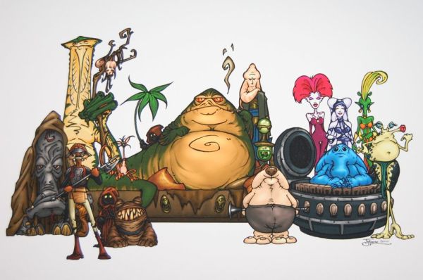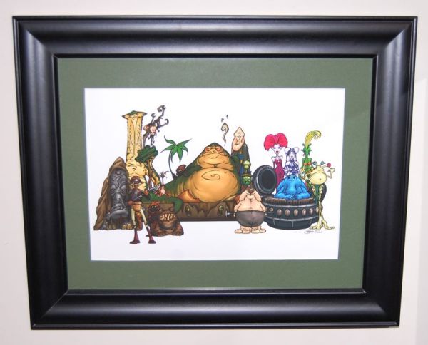 Daniel Falconer is a designer at Weta Workshop who worked on The Lord of the Rings, King Kong, The Chronicles of Narnia and is also involved in the upcoming Hobbit movie. How cool is that? And it turns out that he’s also a bit of a hutt fan. He was kind enough to make me a couple of prints of digital artwork that he did in the past. This is the first one — a montage of characters from Jabba’s palace. The image above is a photo that I took of the 8×10 print, which doesn’t quite capture how nice and crisp it is, or how vibrant the colors are. It really turned out nicely. You can click the image for a larger view, or click here to see a low-res version of the original digital art.