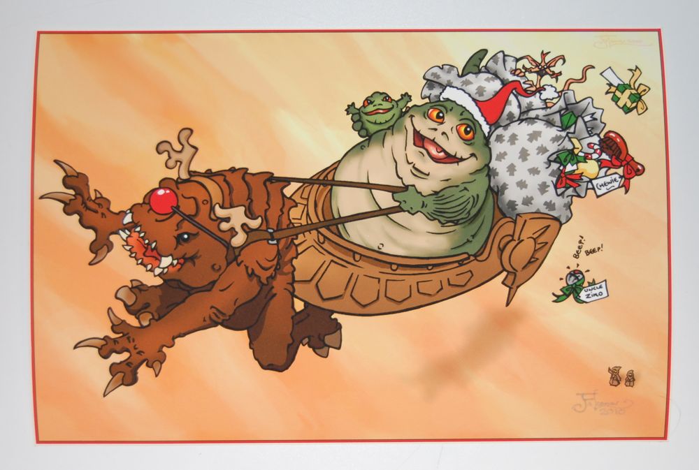 I just love everything about this print. Jabba as Santa, Rudolph the Red-Nosed Rancor, the thermal detonator from “Uncle Ziro,” the comb for Chewbacca, and of course the inclusion of Rotta. It’s all perfect. I plan to bring this out every year at Christmas time.
