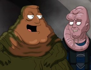 I just picked up “It’s A Trap!” (the third in the series of Family Guy Star Wars parodies). This time they tackled Return of the Jedi, so I thought I would post some screenshots of the Jabba scenes. I thought it was pretty interesting to see how all of the characters translated into the Family Guy style, and some of the jokes from that part of the episode were pretty funny. It’s definitely worth watching if you like Family Guy and Star Wars.