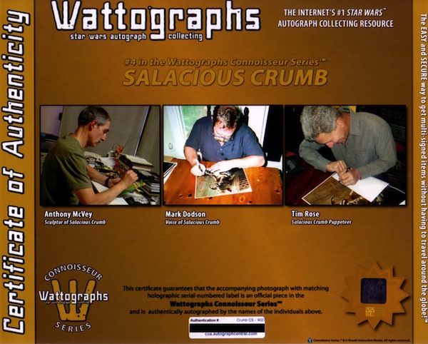 It’s signed by Tim Rose (who was the puppeteer for Crumb, and from whom I also have this autograph), Tony McVey (who sculpted the Crumb puppet), and Mark Dodson (who did the voice). I think it’ll look really nice next to my Jabba CS when it finally gets finished. Wattographs includes a nice certificate of authenticity with their CS pieces showing all of the people signing the piece, which I really like. I’m looking forward to seeing what the Jabba one looks like.