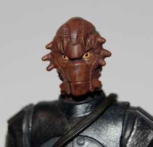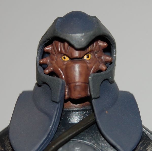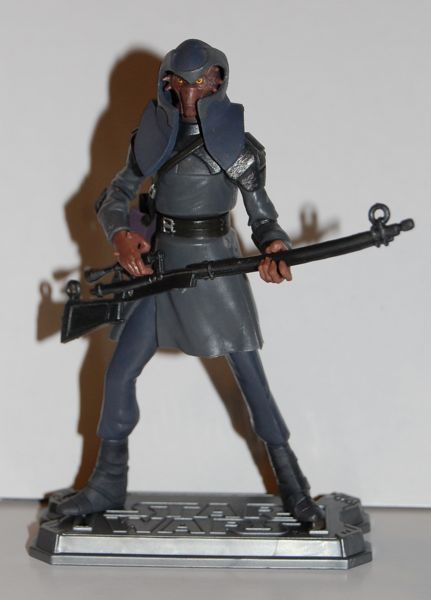 This is one of Jabba’s guards that appears in the Clone Wars cartoon. It’s a Toys R Us-exclusive figure and is currently in stores. From what I understand, it was originally intended to be included with the Clone Wars Jabba the Hutt Battle Pack, but was held back for cost reasons. For a while Toys R Us did give these away with any Star Wars purchase over $30, but now they are just selling them for $10.99 apiece, which seems extremely expensive for this figure. It’s well done, but fairly spindly. His accessories consist of a shoulder bag/holster (with Jabba’s clan tattoo on it), a removable cowl, a blaster pistol, a rifle and a stand. Both of the weapons are made of super soft plastic that barely holds its shape, so it’s hard to keep the rifle from looking like a bent noodle.