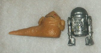 The vintage Jabba figure was also much too large and complicated in its design to easily bootleg, but there was a Mexican “mini-Jabba” figure created. This one is very rare and valuable, so I don’t have one, but it’s MUCH smaller than the vintage Jabba figure. To give you an idea, here is a picture of it next to a bootleg R2 figure.