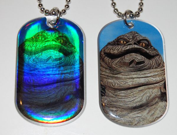 I got the regular Jabba dog tag last year (it’s the one on the right), but this is the super-rare rainbow foil (or “holo”) version of the same tag. Click the link for the full story on these tags, but in short they come in cases of 24, with 24 different characters. One random character among these will be the rainbow foil version instead of the normal one. That means that for every case you open, you have a 1 in 24 chance of getting the rainbow foil version of a particular character. Pretty dismal odds if you want a particular one. And to be honest, it’s not really that impressive. Depending on the angle, it can be difficult to even see the rainbow effect. I had to take several photos in order to get one that made it obvious. Anyway, I picked this up from a Rebelscum.com forum member, and I’m glad to get it. But I’m even gladder that I don’t feel compelled to try and get all of the rainbow versions.