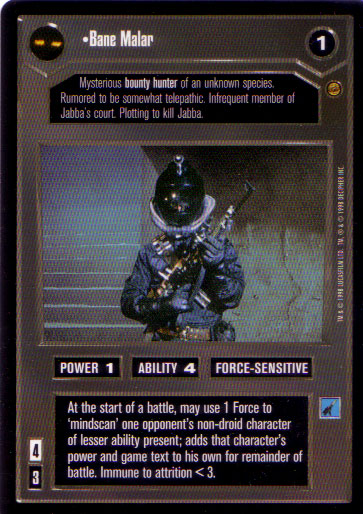 The character of Bane Malar is a bit of an odd case. He only appeared in Return of the Jedi in a deleted scene, and I believe he was just someone standing in the background even then. His first real appearance was in Decipher’s Jabba’s Palace expansion set for their Star Wars Collectible Card Game. I dug out his card just for you, gentle reader. Personally, I think his name is a bit too “on the nose” for a bad guy, although Savage Opress from the new Clone Wars cartoons is even worse in this regard. I’m surprised they didn’t call him “Baddius Evilor” or something.
