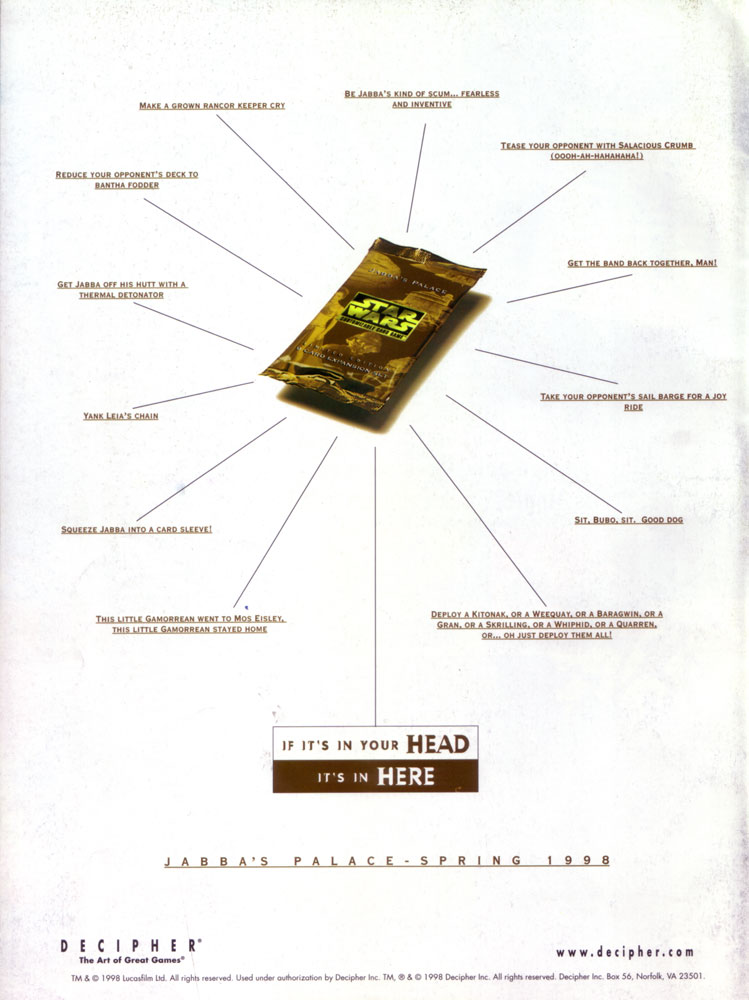 As I mentioned in my entry on the  Jabba’s Palace expansion to Decipher’s Star Wars Collectible Card Game (SWCG), I don’t play these kinds of games and never have. So leafing through a magazine like this is a bit of an odd experience. It’s difficult for me to read more than a sentence or two of any of the articles without my eyes glazing over. Many of them may as well be in a foreign language. That said, it’s interesting to see how many different games there are. In addition to Star Wars, there were Star Trek, Babylon 5, and Shadowrun-based games. The article that goes with the cover story isn’t really all that interesting, since it’s mostly just a preview of the cards that will be included in the Jabba’s Palace expansion set. But I did like the ad for the expansion set that was on the back of the magazine. It’s got some pretty funny descriptions of things you can supposedly do if you get the expansion. Click the image above to view it full size.