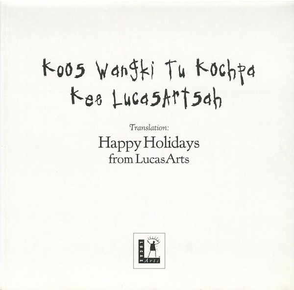 Inside is the message “Koos wangki tu kochpa kee Lucasartsah,” which supposedly means “Happy Holidays from LucasArts” although I don’t know if Huttese is developed enough as a language to really express something like that, or if they just made up something that sounded appropriate.
