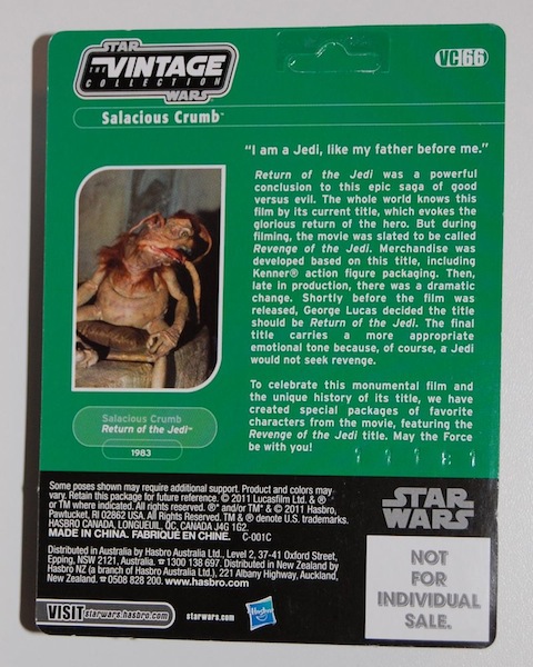 Salacious Crumb has never been released on a card. He’s always been part of a larger product, such as a Jabba playset (like the vintage Jabba Playset or the recent Vintage Collection set), or been paired with another figure, like Oola, C-3PO or Amanaman. (This particular version of Crumb is essentially the same as the one that came with C-3PO and the Vintage Collection set.) It’s hard to tell from pictures, but this is a teeny tiny little card. It’s about 5 x 4 in size.