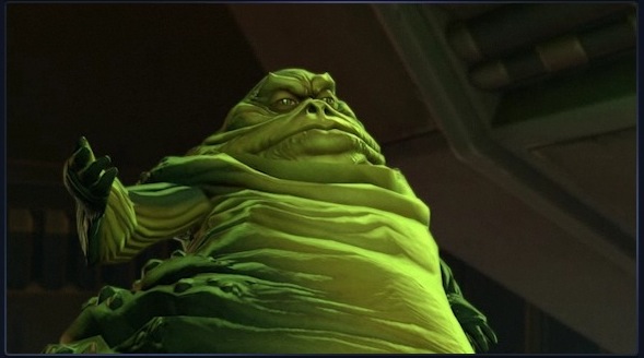I just saw this video about “Huttball,” which appears to be a game sort of similar to “extreme” soccer that players of the Star Wars: The Old Republic MMORPG can play against each other. Apparently it’s supposed to be sponsored by Giradda the Hutt (pictured below).