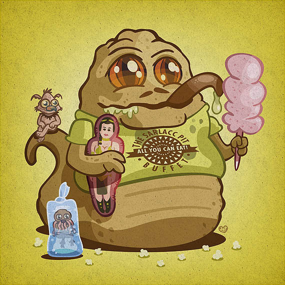 I got this from Etsy seller Octopus Tree House. They have a few similarly styled prints, including one of Boba Fett that works as a sort of companion piece to this one. I really like this print. I’ve got a weakness for cute versions of Jabba. I get a bit of a “Muppet Babies” vibe from this somehow. Anyway, it depicts Jabba after a big day at the carnival, complete with Slave Leia stuffed toy and a froggie snack in a plastic bag. The print is a nice size at 12″ x 12″ (which will apparently fit into a frame intended for displayed a record album) and looks quite good.