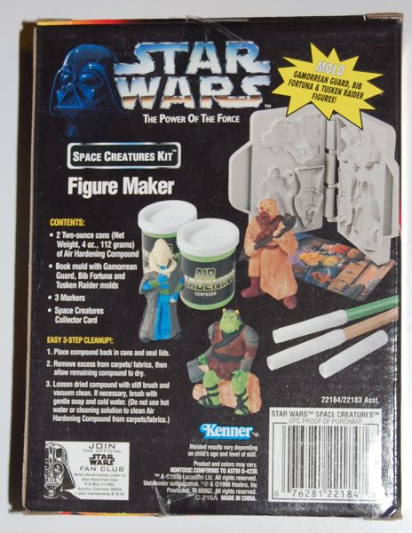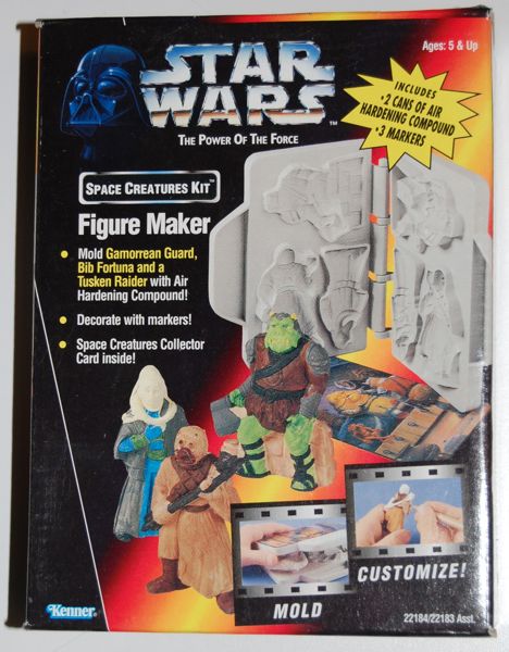 It’s amazing how many Star Wars products there are out there. I’m still running across things that I had never seen before, like this “Figure Maker” kit from Kenner in 1996. It consists of a mold that lets you make three characters (Bib Fortuna, a Gamorrean Guard and a Tusken Raider), some “Air Hardening Compound” and three markers that you’re supposed to use to color your creations after they’ve dried. They also made a couple others with different characters. As I’ve said in the past, I find it odd to feature a character like Bib Fortuna so prominently and not include Jabba.