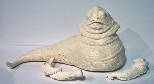 The body has some nice detail and I think the sculpt is really nicely done, if somewhat stylized (reminding me a bit more of the Clone Wars Jabba than the traditional Return of the Jedi version). The arms on the other hand seem a bit rough in their sculpt. His right hand almost seems to be in a “Jedi mind trick” pose. I almost like it better without the arms, especially in this unpainted state — it looks kind of like a “Jabba de Milo” statue. 😉