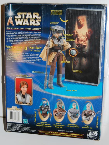 Hasbro released this set in 2003, back before Sideshow Collectibles had the license to make 1/6 scale Star Wars figures (like their own version of Boushh). It comes with one Leia as Boushh figure (which is closer to a Barbie doll than a modern 1/6 scale figure) and one light-up carbonite block.