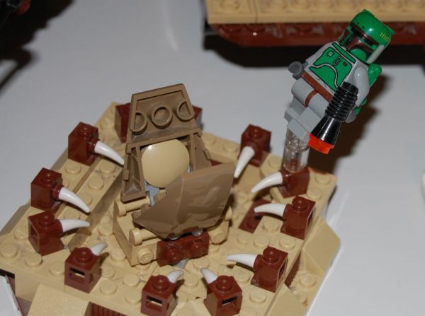 They also used some transparent cylindrical LEGO pieces to show Boba Fett just above the mouth of the sarlacc — I don’t think these are included with the retail set. Mine came off in shipping so I’m not sure where Boba Fett was originally placed.