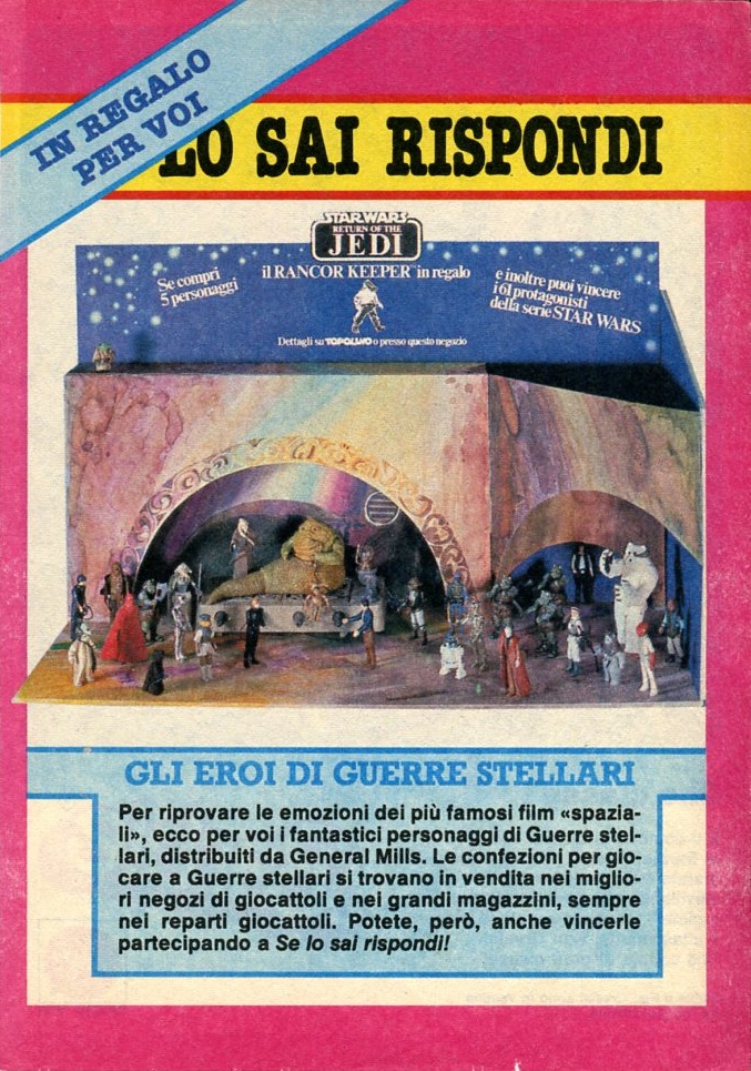 This display is very interesting, since not much is known about it. It was apparently used in stores in Italy around 1983 or 1984. It’s pretty similar in concept to the Power of the Force 3D Jabba’s Palace diorama, although considerably bigger. When I got the ad in hand, it was obvious that the display was actually a bit different than the one on theswca — there was text about a Rancor Keeper figure giveaway across the top (similar to the one on this Palitoy flyer), as well as a mention of some sort of contest where you can win 61 figures. I’ve been told that the display on theswca may be the only one known to exist in a collection, so finding a photo of this different version is pretty interesting.
