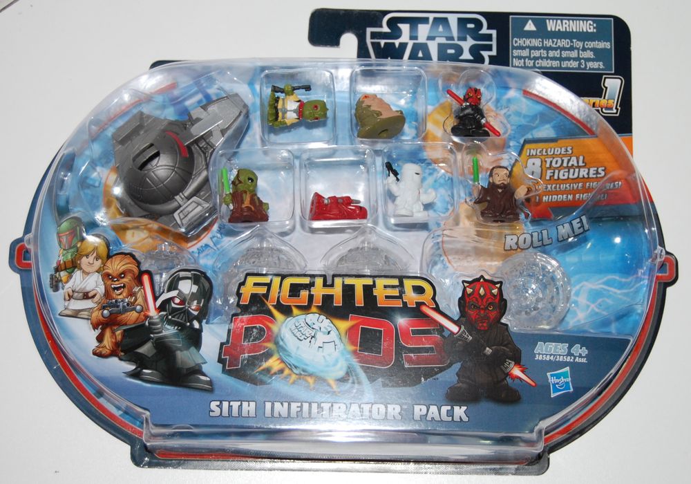 Fighter Pods are only just now starting to appear in stores. They’re Hasbro’s answer to Squinkies, which are teeny tiny little figures made for a variety of licenses, including Disney, Hello Kitty, and Marvel Comics to name a few. Apparently they’re pretty popular. Hasbro ‘s first wave of Star Wars Fighter Pods includes a variety of Star Wars characters from both the original trilogy and the prequels, and they come with little spherical cases that you can insert the figures into and then spin them like tops. I guess the idea is that you can do battle somehow, but I’m not really sure I get that aspect of it. They also make some cases that are shaped like vehicles (in this case, I got Darth Maul’s Sith Infiltrator).