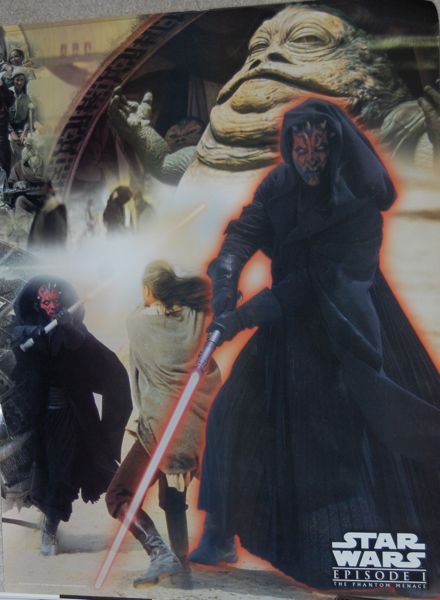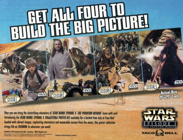 When I first saw this poster, I wasn’t sure what to make of it. The composition is terrible. It’s got Jabba in the background and two Darth Mauls for no apparent reason. But when I got my copy from an ebay seller, it also had a Taco Bell flyer rolled in with it, which showed that this was one of 4 posters that link together to form one large collage of images from The Phantom Menace. In that context it makes little bit more sense, but I still think they should’ve made each individual poster work separately as well as part of the overall collage. Each poster is 17″ x 22″ so the entire collage would be rather large.