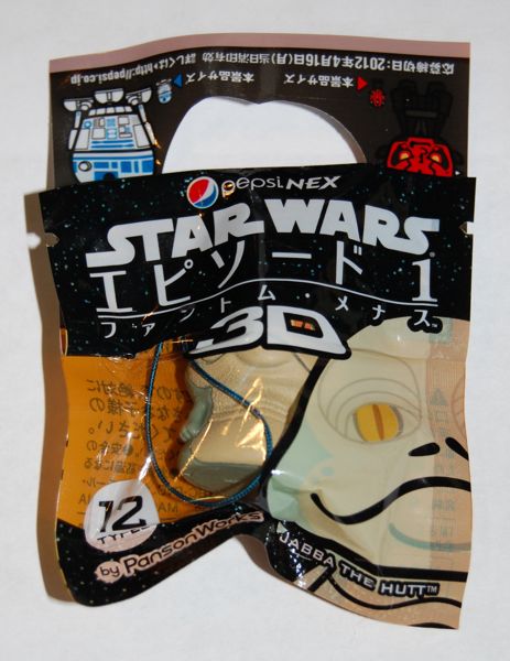I posted about this figure a few weeks ago when I first heard about it. As I mentioned then, Panson Works made 12 different characters in this style to coincide with the release of the Phantom Menace in 3D in Japan. They’re free with the purchase of a bottle of Pepsi NEX. Each one is around 1″ tall and has a string attached to the top that allows it to be used as a keychain charm or cell phone charm. I think the Jabba one is really quite cute — cuter than the Fighter Pods Jabba for sure.