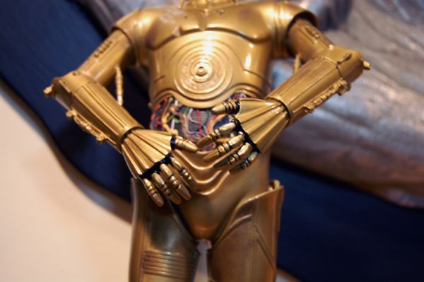 No, this isn’t an April Fool’s post. It’s true that strictly speaking this isn’t a Jabba-related item, but anyone who wants to put together a full display of Attakus Jabba’s palace statues will want to include C-3PO to act as Jabba’s interpreter. My first impression on opening this up was that it looked better than I expected. From pictures, I knew that it didn’t have a metallic finish (which C-3PO really should have). But it’s not the matte gold finish that I thought it was — he’s got a shiny coating over the gold. It is hard to see in pictures, but it does make it look somewhat better than I expected. It still looks more like shiny polished fiberglass than metal, but it’s not bad. He’s also slightly weathered, although it’s not really very effective or realistic.