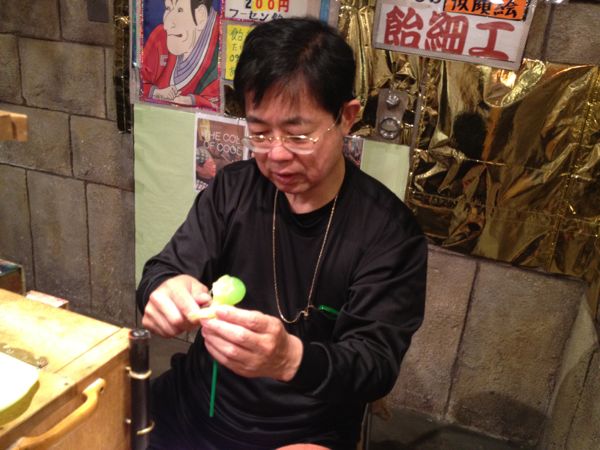 My family and I are in Japan at the moment, and stopped by a place where someone was doing amezaiku — traditional Japanese candy sculptures. He had a number of different things available for sale, like animals and popular cartoon characters, but he would also make just about anything you requested. I naturally decided to have him make me a Jabba.