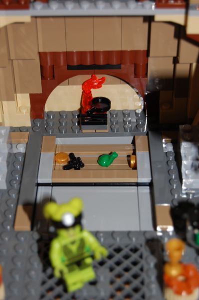 There’s also a little area underneath the throne where you are apparently supposed to store things like gold, a froggy snack and a spare gun. I like how they recreated the barbecue behind Jabba (complete with frying pan :D). The designers of this set really took their time to get a lot of the little details right.