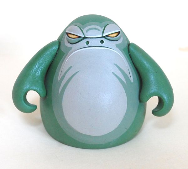 This custom figure was made by UK artist Stuart Witter. It’s based on a Kidrobot Munny Rooz figure. The Munny figure (in the shape of a rabbit) has been the basis for all kinds of amazing customs, and Kidrobot has come out with a variety of other blank figures in the shapes of different animals. The Rooz is in the basic shape of a kangaroo, but Stuart removed the head and added some sculpted elements to turn it into Jabba. I’ve made some custom Mighty Muggs (like this Jabba the Hutt), so I know how hard it can be to create and execute a design like this, even though it may seem relatively simple. I think he did a great job of utilizing the existing shape of the Rooz figure. It’s about 2.5 inches tall.
