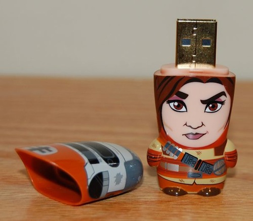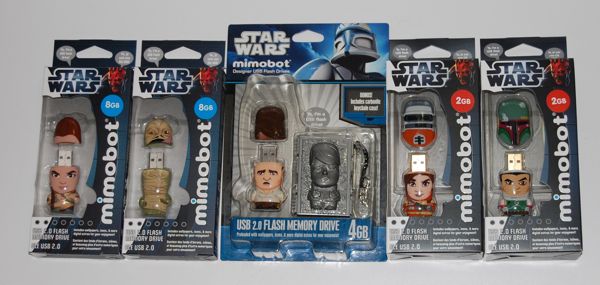 Yesterday I posted about the Jabba and Slave Leia Mimobots that Mimoco just release as part of Mimobot Series 8. But I also picked up three from Series 7, which came out last year. Above, you can see all of them in their packages. The series 7 and 8 drives come in essentially the same generic packaging, with nothing on the package to distinguish one character from another, aside from a sticker. (Han in the middle is in a different kind of package due to his case.)