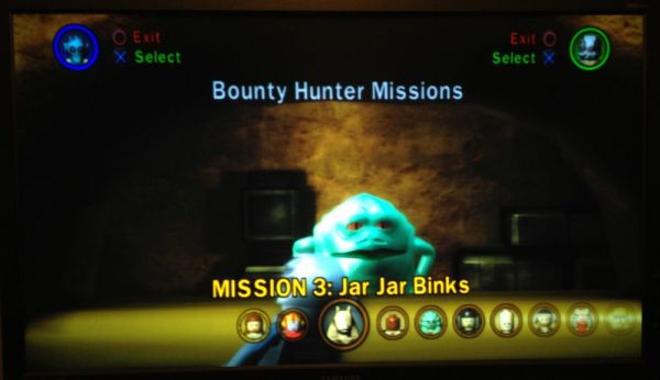 When you unlock Jabba’s office area (which, from what I can tell, requires that you finish all of the levels in the game and unlock all of the bounty hunter characters from the original trilogy), you can then visit him and select from 20 “bounty hunter missions.” In these missions, you play through some of the same levels that you played through in the normal game, but this time you play as the bounty hunters (and can switch freely between them). The goal is to find your bounty in the level before your time runs out. I’m not sure if anything happens when you complete all 20 levels, but I was happy to finally see Jabba in the game at least.