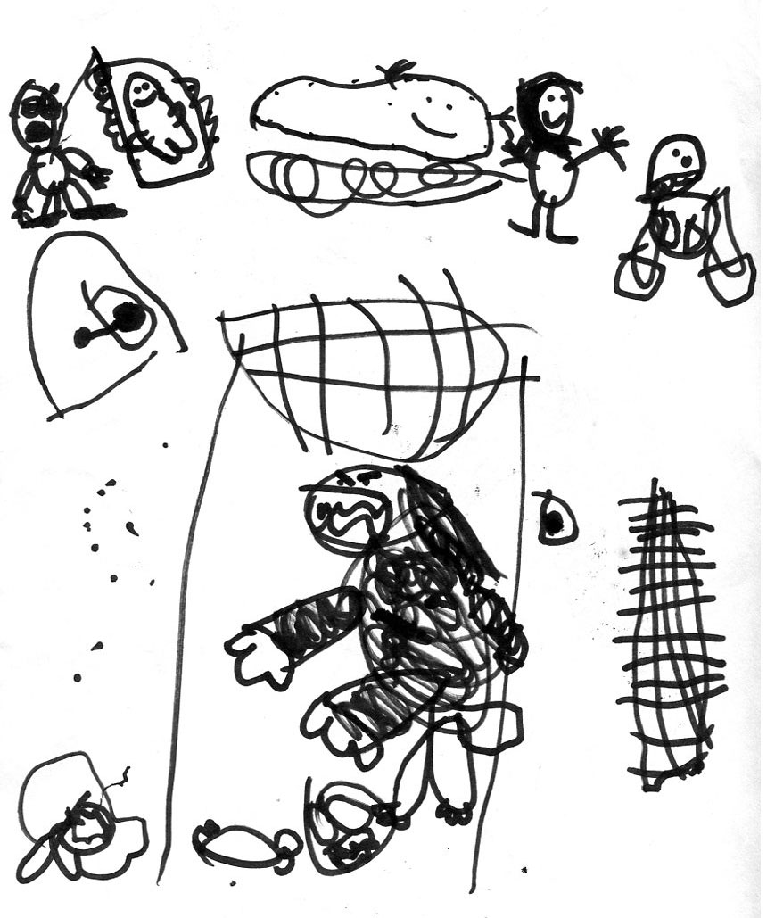 I’ve posted things that my son has made for me in the past, like a Jabba stick puppet, or a Jabba’s Palace playset made from paper cutouts. Yesterday, he surprised me with this drawing. From left to right, there’s C-3PO, Han in Carbonite, Jabba on his throne, Bib Fortuna, and R2-D2, with the rancor pit below, complete with gate and button. (He also said that the thing in the bottom left was the Sarlacc.) He said he did it all from memory, which impressed me. He’s definitely got more knowledge of Jabba’s palace than the average kid ;). He was very excited when I told him I would put his drawing on my site, so here it is. 🙂