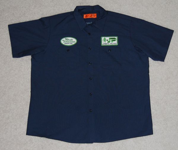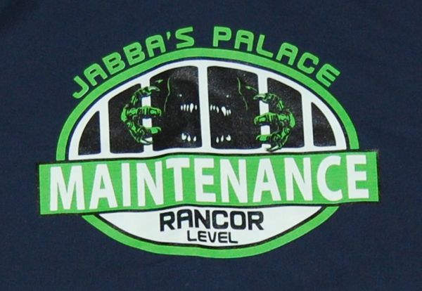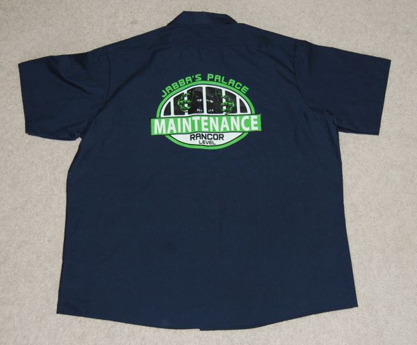 The idea is that this shirt would be worn by one of the grunts at Jabba’s Palace — specifically the guy in charge of scooping up rancor poop. It’s similar in style to shirts worn by mechanics or maintenance men, with patches on the front.