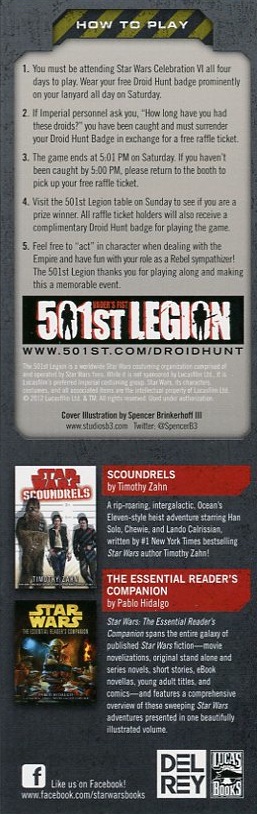 The 501st Legion has been holding a “Droid Hunt” event at the last few celebrations. There’s a video here that explains it in detail, but essentially you would go to the 501st’s booth to get a badge that you would wear the following day. If a costumed member of the 501st saw it and said the “pass phrase,” you had to surrender your badge, but would be presented with a raffle ticket that might be used to win prizes.