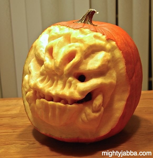 Here’s my next attempt at a 3D sculpted pumpkin — the Rancor Monster. This particular pumpkin was grainier in texture than the one I used for Bib Fortuna, so it was a bit harder to sculpt, but I think it came out fairly well.