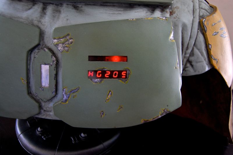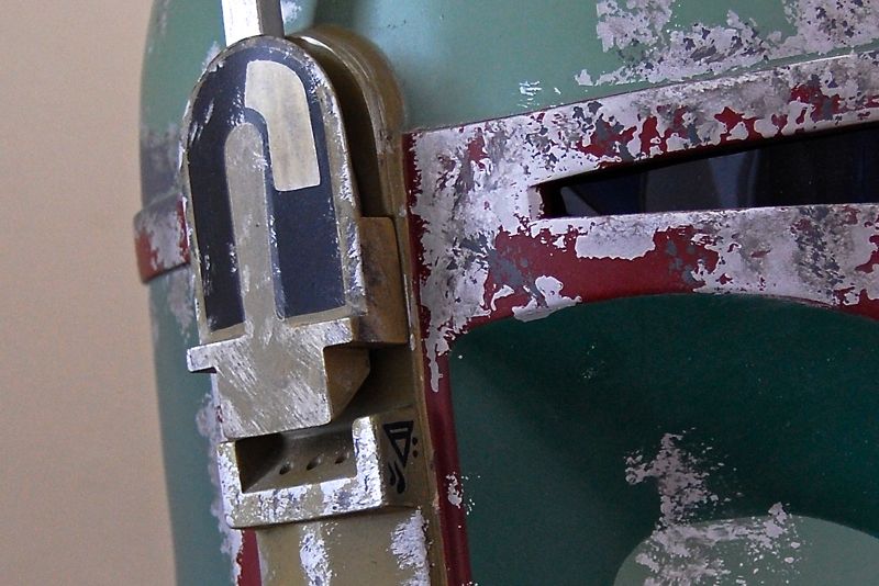 There was quite a bit of griping from Boba Fett fans when this was originally announced. Some of it was certainly merited. Boba Fett’s costume is one of the most complex in Star Wars, so there’s a lot that can go wrong, from the color to the placement of the weathering and shape of the armor. The biggest complaint seemed to be that the original prototype had a “pinched” visor that got smaller as it went from the eye area to the bottom of the helmet, which isn’t accurate. Sideshow makes some great products, but generally speaking they don’t seem overly concerned with accuracy. They want to make a statue that looks good overall, but don’t seem to mind if there are some inaccuracies. That’s why I was pleasantly surprised to find out that they actually corrected the helmet in the final product. If anything, their products tend to get worse in production, since the factory paint job is usually not as nice as the one on the prototype. But in this case, even the paint seems pretty much as good as the prototype. The weathering is nicely done. While you can tell that it’s not really chipped and worn paint if you look at it closely, when viewed from a reasonable distance the effect is very impressive.