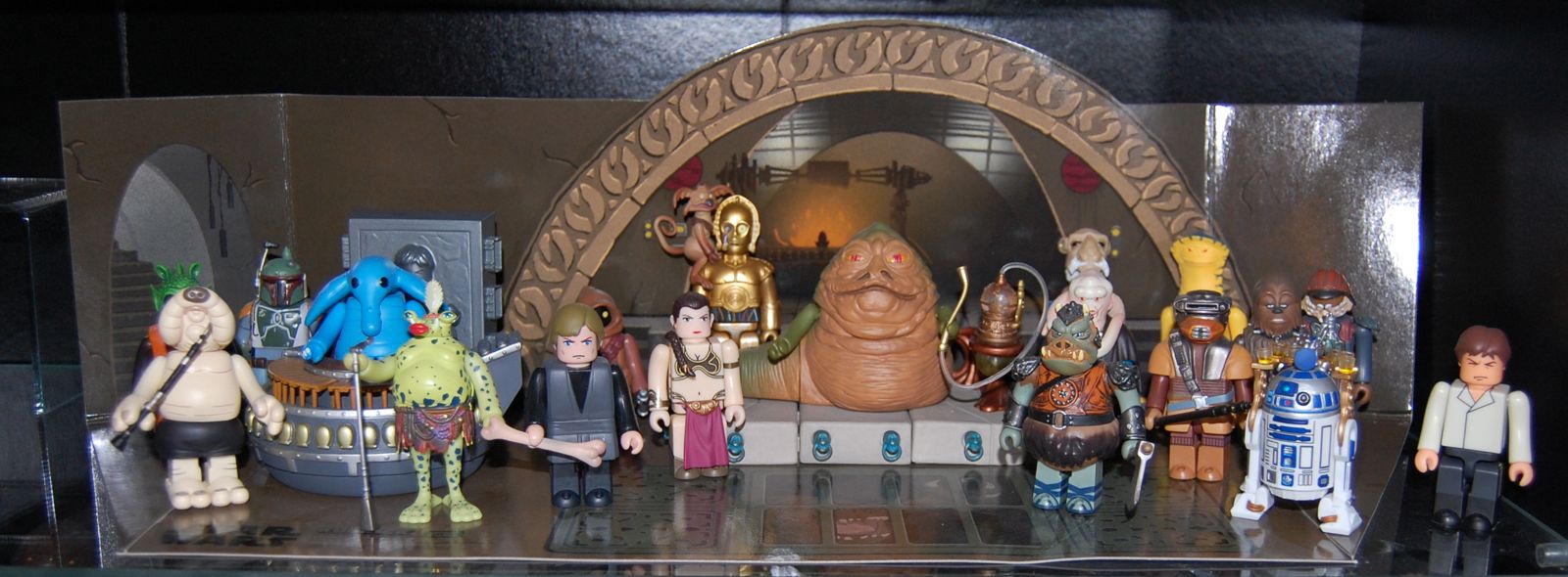 He comes with a vibro-axe and a nice cloak that is painted in an attractive gradient. You can see him in my Jabba’s palace display below. It’s pretty much complete. I don’t have the chase versions of Boba Fett (ROTJ version) or Bib Fortuna (Red Cloak) but since they’re so similar to the normal versions, I don’t think I’ll be picking them up unless I can find a really good deal.