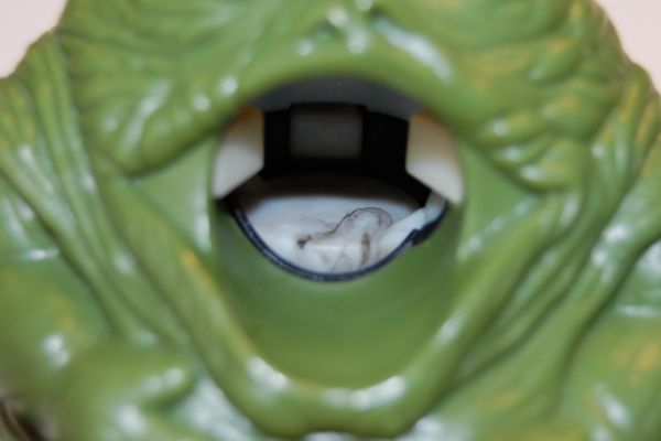 It also uses a different colored plastic for the lever on the back (white instead of green). (On the production figure, the white on Jabba’s front is actually paint that has been applied over the green plastic.) I got one of the blue balls that Jabba fires with this prototype, and it’s also a slightly different color than the production balls (a darker blue).